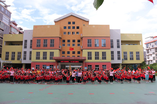 活動現場,教師代表為在場的老人們致歡迎詞,表達對老人們的節日祝福。伴隨著《義勇軍進行曲》激情澎湃的歌聲響起,現場的老人和師生們全體肅立,向國旗敬禮,慶祝中華人民共和國成立70周年。“我和我的祖國一刻也不能分割……”,當這熟悉而優美的旋律環繞現場,所有老人和師生們揮舞著五星紅旗,齊唱《我和我的祖國》。最后,老人與幼兒一起手持愛國標語,與愛國作品一起濃情告白我們的祖國,共同祝福偉大的祖國更加繁榮富強。