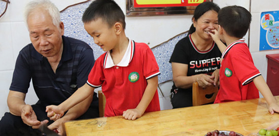 活動組織幼兒為爺爺奶奶捶背揉肩,給爺爺奶奶敬菊花茶等感恩活動。在“祖孫同臺樂”游戲環節中,現場一片歡聲笑語,洋溢著濃濃的愛意。68歲的謝德勝老人噙著感動的淚表示,生活在和平年代,我們是幸運的,生活在中國,是自豪的。