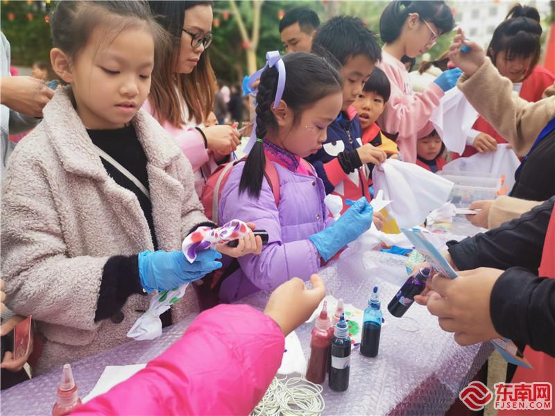 孩子們興致勃勃地參與現場扎染。 盧超穎 攝