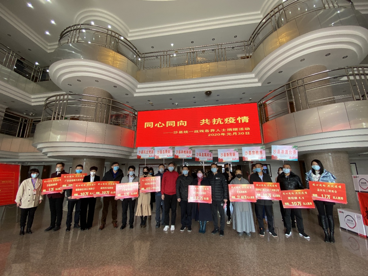 自沙縣縣委統戰部發出了《同心同向共抗疫情——致沙縣統一戰線各界人士的公開信》,號召全縣各民主黨派、工商聯、新階聯、民族宗教界、各統戰團體以及統一戰線廣大成員積極積極支援疫情防控工作以來,愛心就像接力棒一樣在虬城里傳遞。截至1月30日晚,沙縣共收到捐款捐物總價值超160萬元,其中愛心捐款100.04萬元,醫用口罩、防護服、醫用酒精等各類防護物資價值超60萬元。