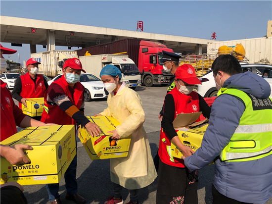 企業捐贈的水果分發到值勤志愿者、交通執法、醫護等一線人員手中。葉春躍 攝