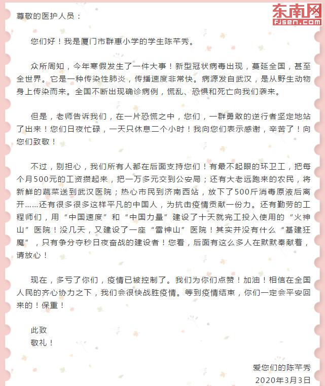 思明區小學生與廈門市馳援湖北的醫護人員“鴻雁傳書”的故事溫暖了無數人。近日,廈門市群惠小學開展《眾志成城,抗擊疫情——致醫務人員的一封信》活動,張妙然、陳芊秀等兩位小朋友的信跨越千山萬水,輾轉送到廈門市支援湖北醫療一隊醫務人員手中。兩封來自家鄉的溫情“家書”讓前線的醫護人員深受感動,他們第一時間給孩子們回信,并且相約:待到花開疫散,一起講述抗疫故事。