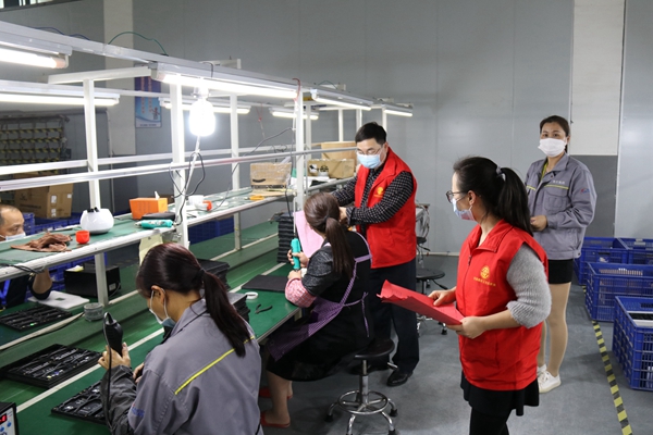 縣總工會志愿者向福建海佳彩亮光電科技有限公司維修部員工宣傳相關(guān)知識。黃珊珊 供圖