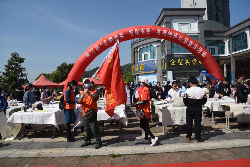 活動現場,書法愛好者分成人組和青少年組,他們頂著烈日專心致志地創造作品,揮毫潑墨,書寫了“文明健康 有你有我”、“使用公筷 文明就餐”,“拒絕野味 守護健康”等宣傳內容的字畫。廣大文明志愿者以開展志愿服務活動的形式,向全縣發出“文明健康 有你有我”的倡議,號召廣大市民爭做文明市民、共建文明城市。