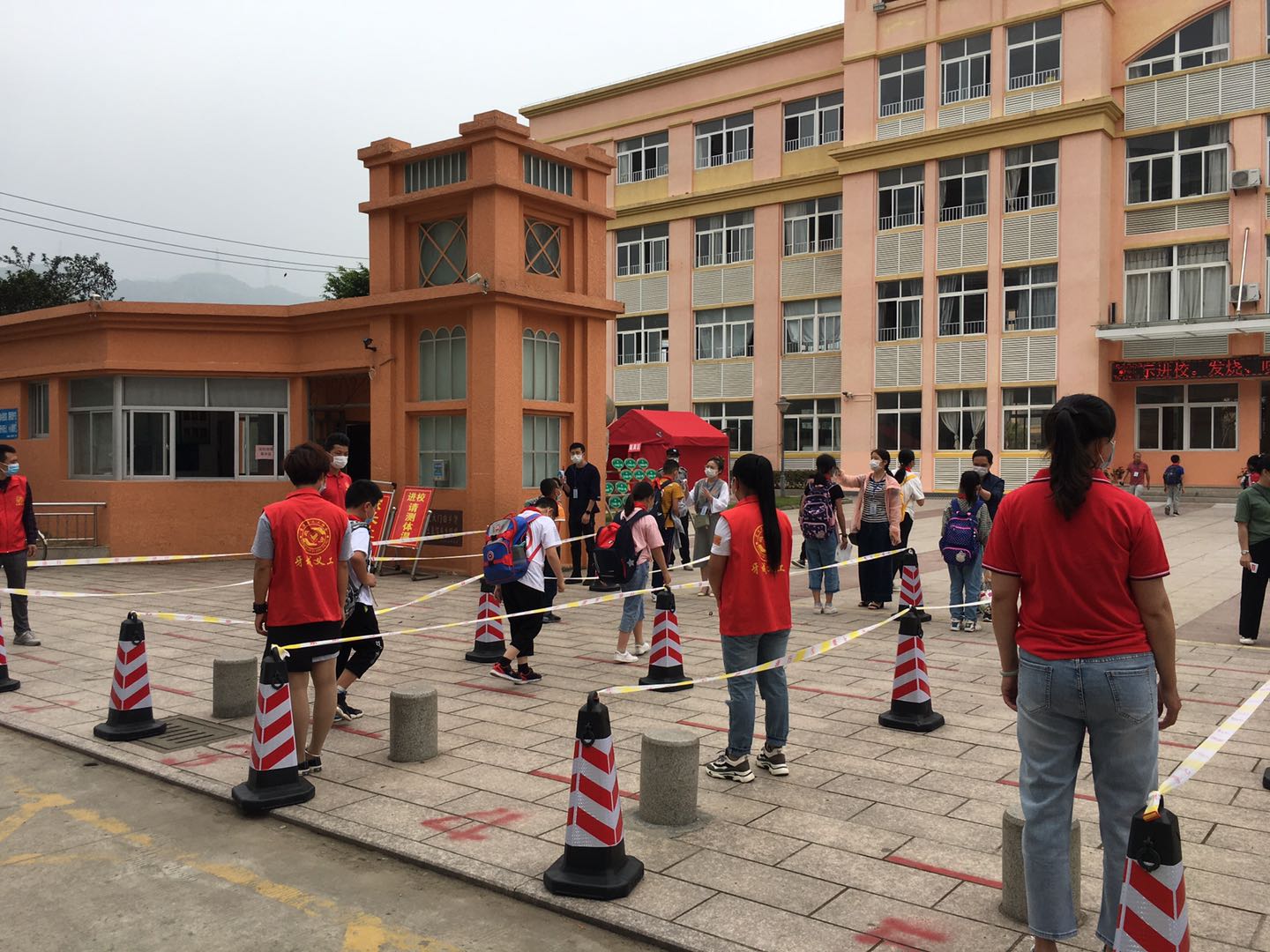 2020年5月18日,牙城鎮志愿者在牙城中心小學協助學生周一入校(牙城鎮供圖)