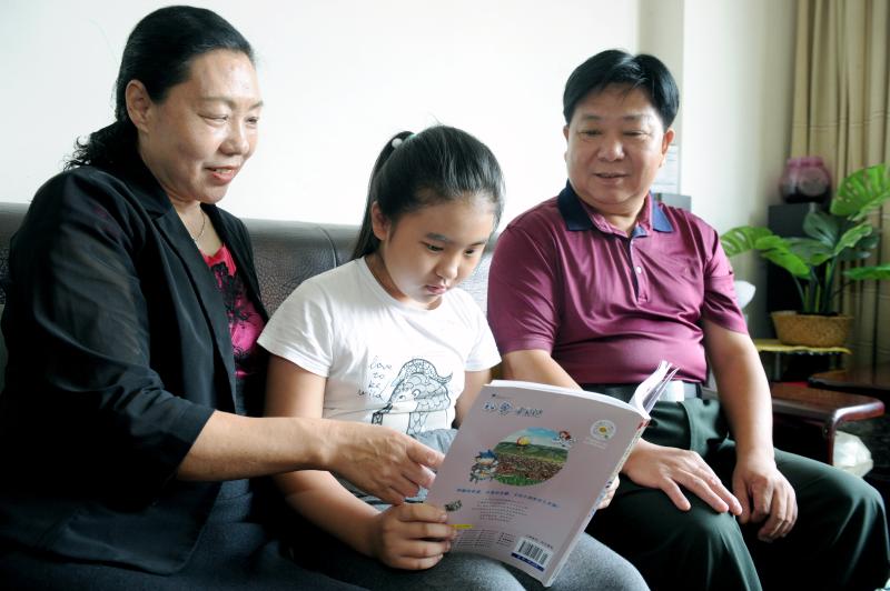 文明家庭呂慶旺、巢鳳英正在陪外孫女看書。 石美祥 攝