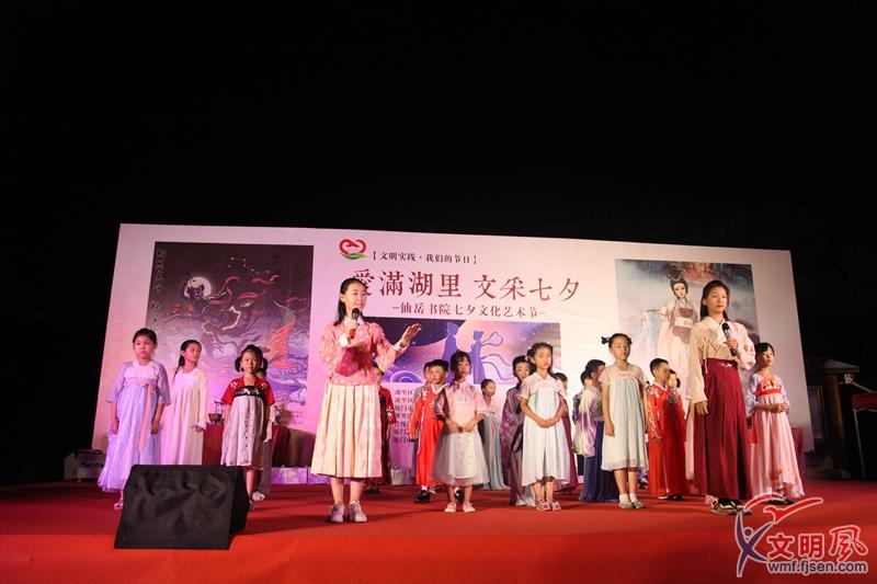 七夕文化匯演前,“雙星祭典”民俗儀式率先登場。仙岳公園文化廣場的舞臺上,身著漢服的禮儀官按照傳統形式“拜魁星”“祭七娘”,儀式古樸、莊重,禮儀官口頌祈愿祝詞,有諸多美好含義,讓人沉浸在濃郁的民俗氛圍里。