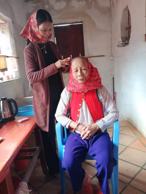 兒媳黃麗英為婆婆梳頭。李明珠 攝