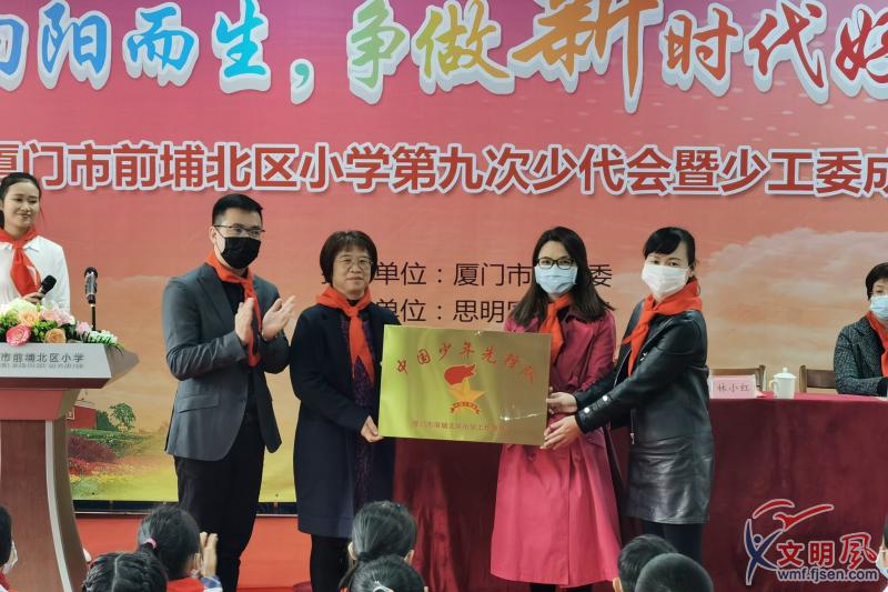 隨后,石亞珠宣讀了學(xué)校少工委組織機(jī)構(gòu)名單,并邀請(qǐng)領(lǐng)導(dǎo)嘉賓們?yōu)樯俟の蓡T們頒發(fā)聘書(shū)。思明區(qū)教育局紀(jì)工委書(shū)記林小紅和思明區(qū)教育少先隊(duì)總輔導(dǎo)員呂文耀共同為“廈門(mén)市前埔北區(qū)小學(xué)少工委”授牌,前埔北區(qū)小學(xué)少先隊(duì)工作委員會(huì)正式成立。