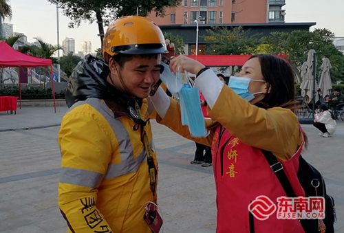 志愿者幫助外賣小哥佩戴口罩。彩燕 供圖