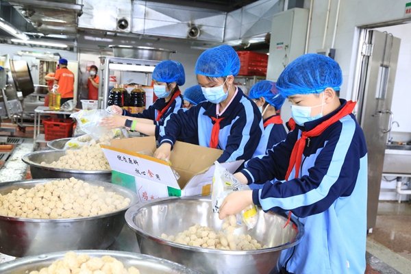 在工作人員的指導下,孩子們親身體驗了美味菜肴的制作過程。為冬瓜削皮,放入切塊機切成小塊,給蘿卜洗澡,最后還體驗了一把炸雞米花的“熱燙”……辛苦勞動,讓孩子們不禁發(fā)出感嘆:“一粥一飯,當思來處不易;半絲半縷,恒念物力維艱。”