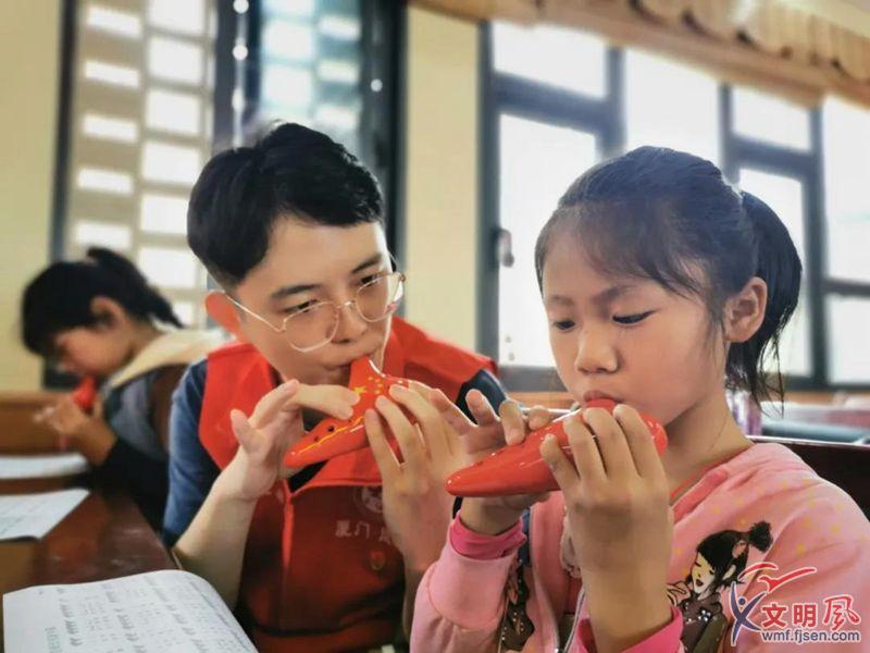 志愿者和孩子們一起學習吹奏陶笛。(同心慈善會供圖)