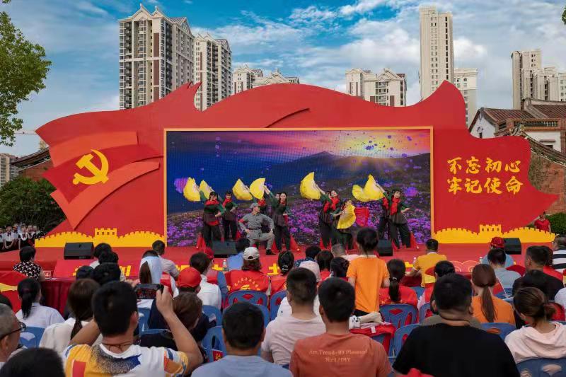 “永遠跟黨走”文化惠民演出由器樂合奏《唱支山歌給黨聽》拉開序幕,舞蹈《映山紅》、歌曲《我愛你中華》、《把一切獻給黨》、朗誦《我和我的祖國》、廣場舞《祖國,你好》等紅色經典節目輪番上陣,給現場觀眾帶來了一場別樣的視聽盛宴,一首《沒有共產黨就沒有新中國》大合唱更是讓演員和觀眾一起互動,把活動推向高潮。