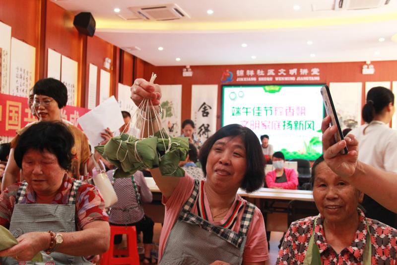 端午佳節粽香飄。活動邀請轄區內最美家庭、文明家庭、社區市民、文明志愿者等參與端午節民俗活動。在錦祥社區文明禮堂內,大家有的穿針引線,一針一針細心縫制香囊;有的卷起粽葉、舀一勺糯米、用線纏繞包粽子。現場熱鬧非凡,端午佳節氛圍濃厚。
