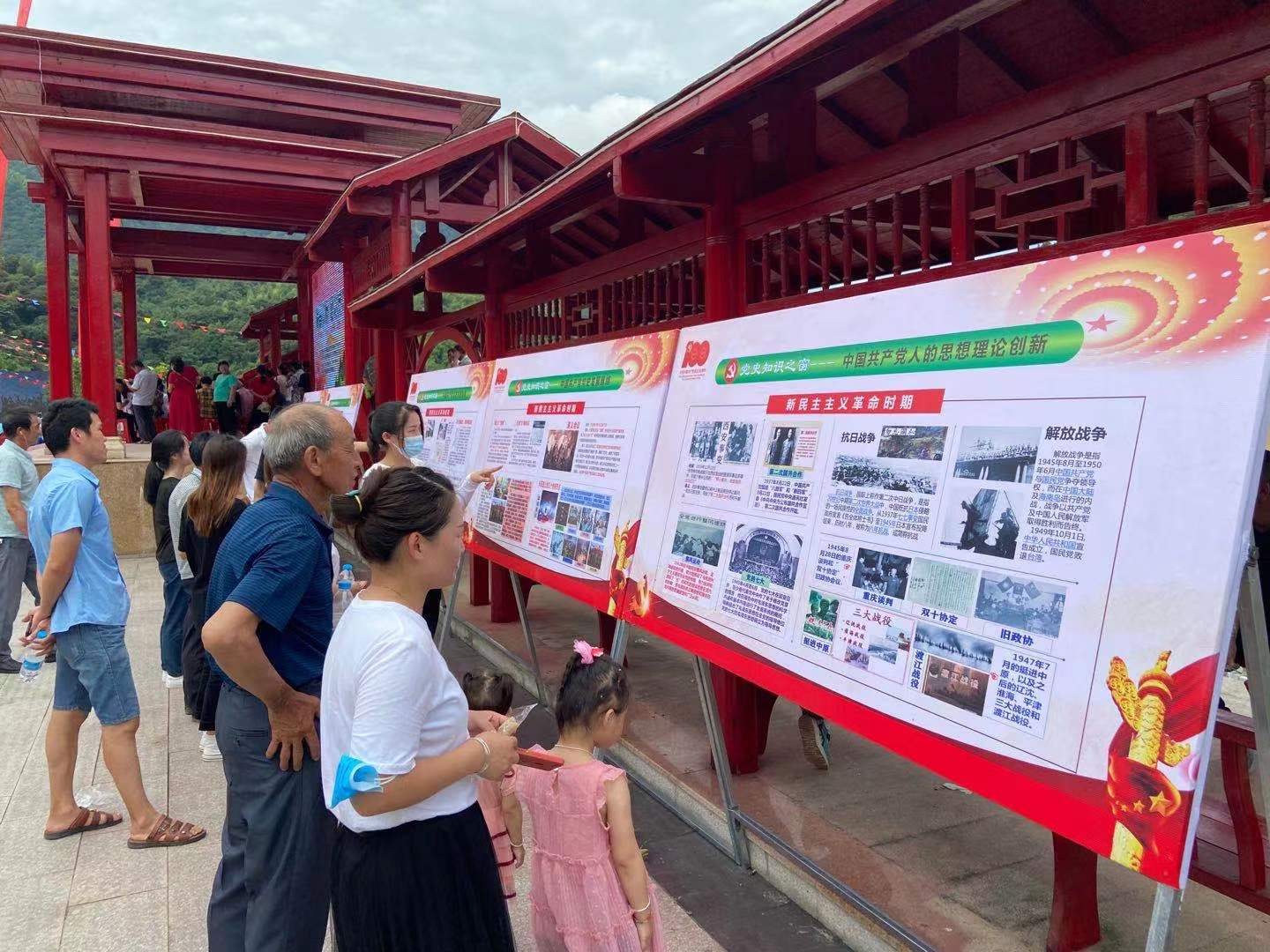 6月12日,在霞浦縣鹽田畬族鄉二鋪村文化廣場舉辦“粽香傳情 感念黨恩”慶祝中國共產黨成立100周年畬歌文化節,圖為群眾在活動現場設置的黨史學習宣傳展位參觀學習 霞浦縣文明辦供圖