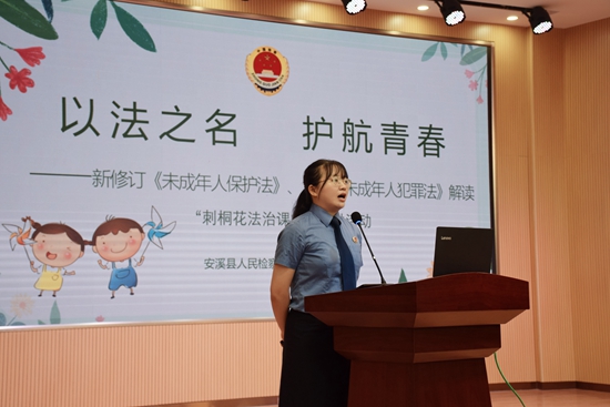 活動現場,安溪第十一小學校組織表演了歌曲《游子吟》、快板《喜慶建黨一百年》、合唱《我和我的祖國》等精彩節目。隨后,縣人民檢察院檢察官助理鐘秋梅講授《以法之名 護航青春》專題法制課,對新修訂《未成年人保護法》《預防未成年人犯罪法》進行解讀。最后,活動在有獎知識問答互動中圓滿結束。(安溪縣第十一小學 黃華玲)