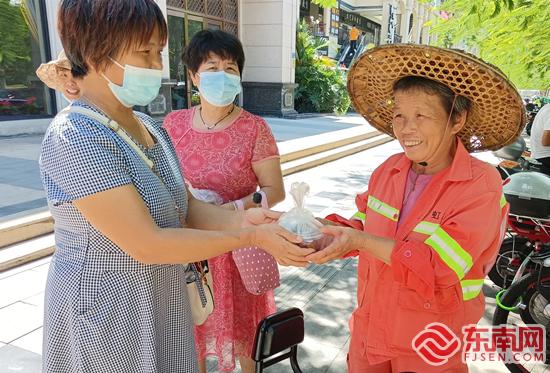 安仁社區(qū)五老服務(wù)隊(duì)為環(huán)衛(wèi)人員送清涼(范亞尼 攝)