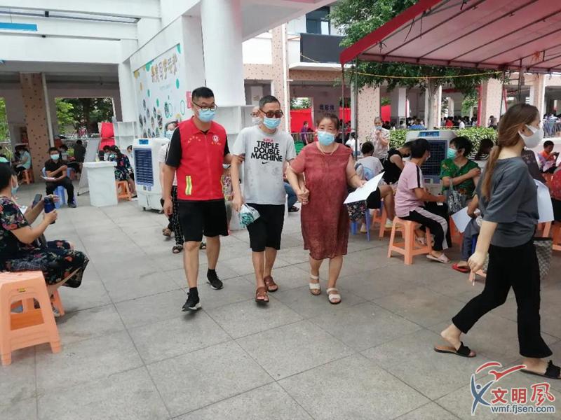 志愿者幫助前來進(jìn)行疫苗接種的群眾,提供力所能及的幫助。(同安區(qū)委文明辦供圖)