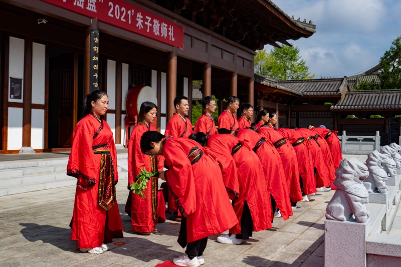 “向中華先賢致鞠躬禮,一鞠躬、二鞠躬、三鞠躬,禮畢。”在考亭書院集成殿,師生們向朱子雕像致鞠躬禮,緬懷朱子。隨后,學生們呈上敬師帖,學生代表行釋菜禮,表達尊師心聲。最后,大家集體誦讀了朱子制定的中國書院發展史上綱領性學規——《白鹿洞書院揭示》,弘揚尚學之道。