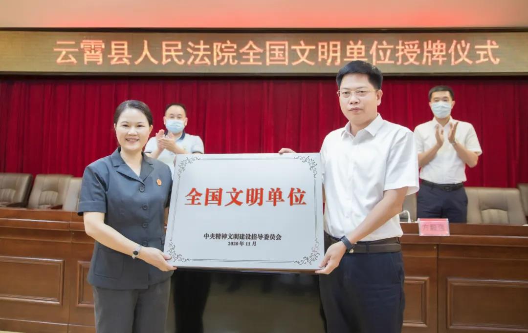 文明風9月15日訊 9月14日下午,云霄縣在縣人民法院舉行全國文明單位授牌儀式,縣委書記藍良木出席活動,并為云霄縣人民法院頒授“全國文明單位”牌匾??h委副書記方毅強,縣委常委、政法委書記徐瑋琳等參加授牌儀式,縣法院院長柯秀娟主持。