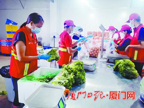在位于洪塘鎮(zhèn)的閩南果蔬批發(fā)市場內(nèi),同安區(qū)靜善義工協(xié)會的志愿者們忙著分包蔬菜。(同安區(qū)供圖)