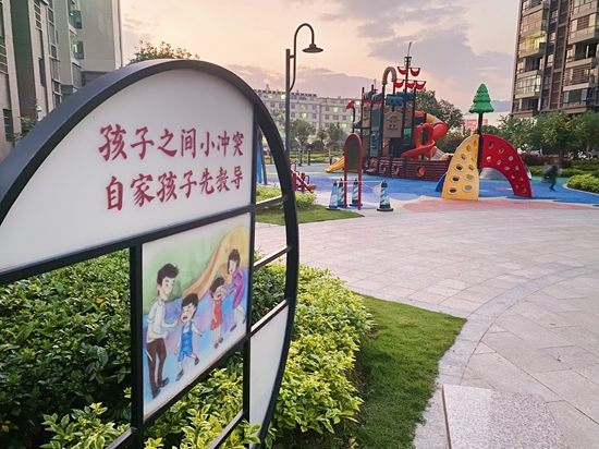 像這樣的微景觀在小區里還有很多,如小區中庭入口處的墻體打造成“左鄰右舍”的樣子,造型別具一格又富含深意;在中心兒童游樂園還設置了“文明美德你我他”古語出處連線點,促進家長孩子之間互動的同時也增加了傳統文化小知識;小區在每棟樓的信箱處標注出了本棟黨員樓戶,倡導黨員以身作則,共同承擔起讓小區更加美好的責任。