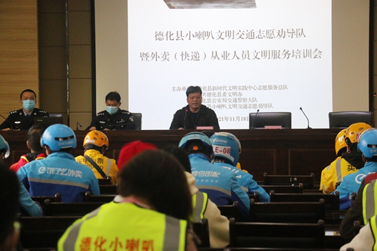 11月18日,德化縣開展小喇叭文明交通志愿勸導隊暨外賣快遞從業(yè)人員文明服務培訓會活動,文明交通志愿勸導隊和外賣、快遞行業(yè)從業(yè)人員等120余人參加培訓。