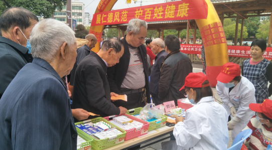 護士給群眾開展量血壓、測心率、測血糖等體檢項目,免費給群眾發放現場醫療專家開具的處方藥品。