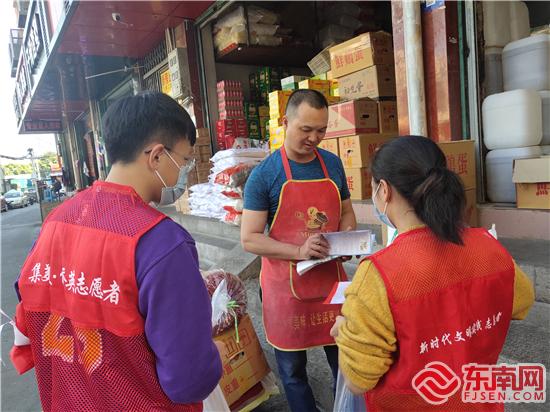 志愿者向商家發(fā)放宣傳單(李欣 攝)