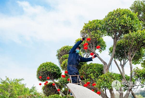 昨日,記者來到萬寶公園,工作人員正在往樹梢上掛小燈籠。紅彤彤的小燈籠掛滿枝頭,冬日的公園瞬間喜慶了不少。在公園的廣場,工作人員則在抓緊安裝春節元素的廣場大型擺件。“我們在萬寶公園既布置了宣傳欄、花卉以及春節擺件,也在樹上掛上了燈籠燈串,以此增添一些過年的喜氣。”實驗區環發公司網格員柯梅云說。