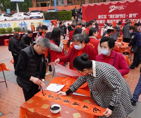 活動在一片歡聲笑語中拉開帷幕,領取春聯的桌子前早已排起了一條條長龍,書法家們揮毫潑墨,為轄區居民送上寫滿祝福的春聯。“虎添雙翼前程遠 國展宏圖事業新”“移風易俗春常在,人壽年豐福無邊”,雋秀的字體配上喜慶的祝福,引來現場群眾的陣陣稱贊,拿到春聯的大爺大媽們喜笑顏開,紛紛表示手寫的春聯更有寓意,更富年味。“活動氛圍熱鬧、喜慶,活動內容切實、惠民,更重要的是弘揚了我們的優秀傳統文化,值得點贊”居民劉大叔說到。