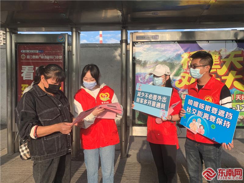 志愿者向過往的居民宣傳文明過節和疫情防控知識(杏濱街道新時代文明實踐志愿服務隊供圖)