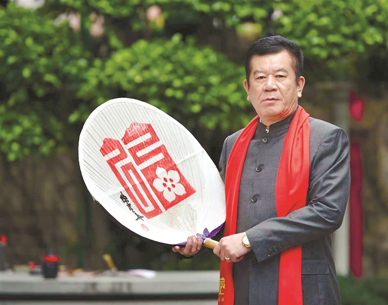 “五福福建”Logo設(shè)計(jì)者陳繆華在官埔油扇上畫“福”。閩東日?qǐng)?bào)供圖