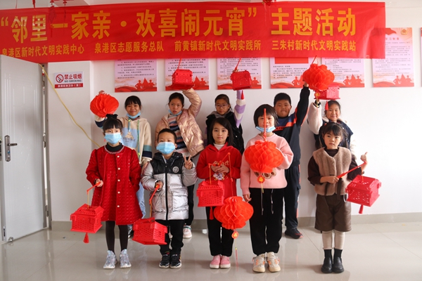 上午9點,一場熱鬧喜慶的做燈籠活動在前黃鎮三朱村文明實踐站準時開始。現場,志愿者向孩子們介紹元宵節的起源、風俗。志愿者為孩子們分發材料包,講解燈籠的制作步驟。拿到材料包的孩子們迫不及待地打開材料研究起來。將部件沿著折痕折出形狀,給燈籠底部裝上彩燈,頂部裝上燈桿,掛上寫有燈謎的流蘇……一個個漂亮的元宵燈籠就做好了。孩子們提著自己親手制作的燈籠成就感滿滿,笑得合不攏嘴,紛紛與自己制作的燈籠合影留念。