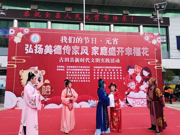 文明風(fēng)2月16日訊 辭舊鞭炮催春潮,迎新鑼鼓鬧元宵。元宵節(jié)是中國(guó)的傳統(tǒng)節(jié)日之一,為弘揚(yáng)中華優(yōu)秀傳統(tǒng)文化,增強(qiáng)廣大干部群眾的文化自覺(jué)和文化自信,2月15日上午,由古田縣新時(shí)代文明實(shí)踐中心、古田縣新時(shí)代文明實(shí)踐志愿服務(wù)總隊(duì)主辦,中共古田縣委宣傳部(文明辦)、古田縣婦女聯(lián)合會(huì)、宣傳宣講等6支志愿服務(wù)隊(duì)及古田縣愛心公益聯(lián)合會(huì)承辦的“我們的節(jié)日?元宵”——“弘揚(yáng)美德傳家風(fēng) 家庭盛開幸福花”新時(shí)代文明實(shí)踐志愿服務(wù)活動(dòng)在古田縣文化廣場(chǎng)舉行。縣委常委、宣傳部部長(zhǎng)蔡晶晶參加了此次活動(dòng),并為群眾送上節(jié)日的祝福。