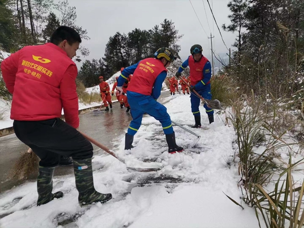 文明風(fēng)2月21日訊 2月19日晚,福安市曉陽(yáng)鎮(zhèn)迎來(lái)了2022年的第一場(chǎng)雪,雪景吸引眾多游客們前來(lái)打卡拍照。然而,路面積雪帶來(lái)了極大的道路交通安全隱患,為及時(shí)消除極端天氣帶來(lái)的影響,2月20日,福安市曉陽(yáng)鎮(zhèn)路長(zhǎng)辦、道安辦、派出所、福安市藍(lán)天救援隊(duì)曉陽(yáng)中隊(duì)等多個(gè)部門(mén)組織志愿者開(kāi)展“破冰行動(dòng)”。