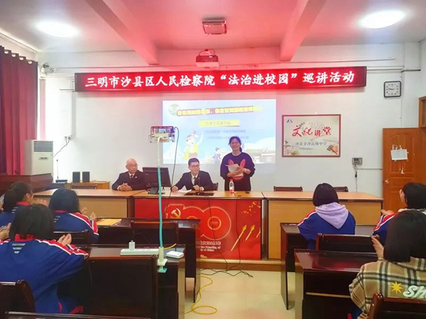 文明風3月1日訊 在新學期到來之際,2月28日,三明市沙縣區人民檢察院未檢檢察官走進金沙高級中學,以現場教學和視頻直播相結合的方式為全校學生上了一堂精彩的法治課。