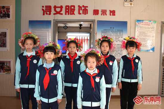 分發(fā)、束發(fā)、盤頭、插花、定型……在臨海小學(xué)的“蟳女服飾展示館”里,十幾名孩子在老師的帶領(lǐng)下,能在二十分鐘內(nèi)盤完一個(gè)蟳埔女傳統(tǒng)頭飾“簪花圍”。蟳女頭飾是當(dāng)?shù)氐拿袼滋厣挥鳛榕宇^上“流動(dòng)的花園”。復(fù)雜的頭飾制作并沒(méi)有讓孩子們失去興趣,反而更認(rèn)真地進(jìn)行學(xué)習(xí)。