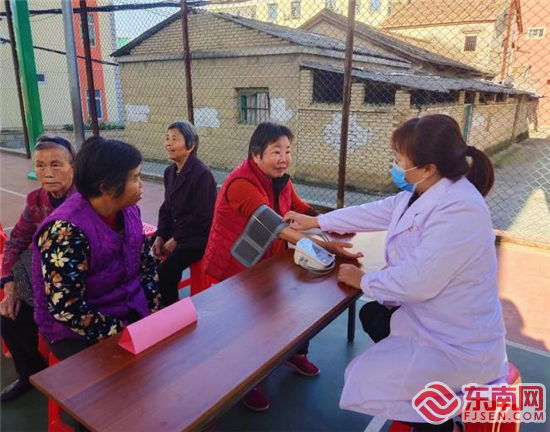 在愛心義診區域,醫務人員為老人測量血壓。(前場社區新時代文明實踐站供圖)