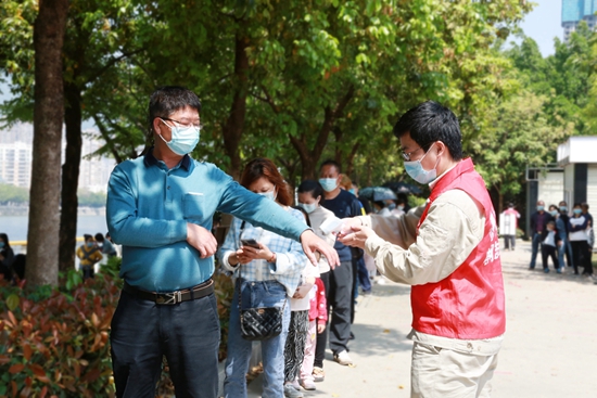 “請大家佩戴好口罩,保持一米距離!”“請您配合一下掃碼、測溫!”志愿者們在核酸檢測點耐心提醒著前來檢測的居民,雖是簡單的幾句話,但每位志愿者每天都要重復上百遍。