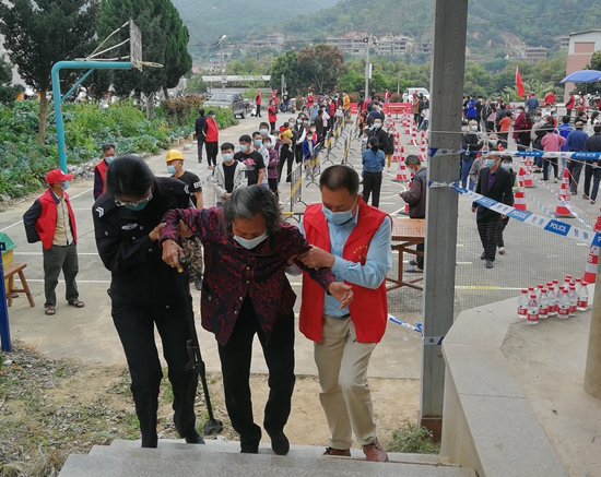 志愿者幫助老人前往核酸檢測現(xiàn)場。安溪縣委文明辦供圖