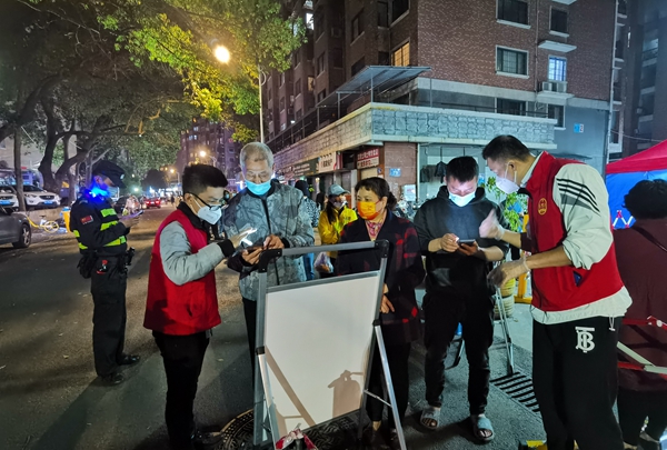 在倉山區對湖街道石巖路,社會志愿者協助市民預約核酸檢測碼。陳文供圖