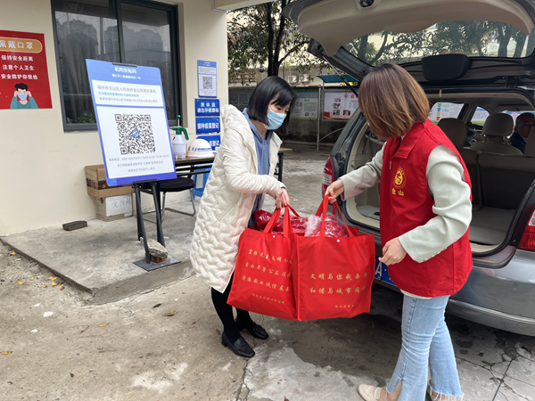 倉山區(qū)委文明辦工作人員將志愿紅馬甲等物資送抵金山街道。倉山區(qū)委文明辦供圖