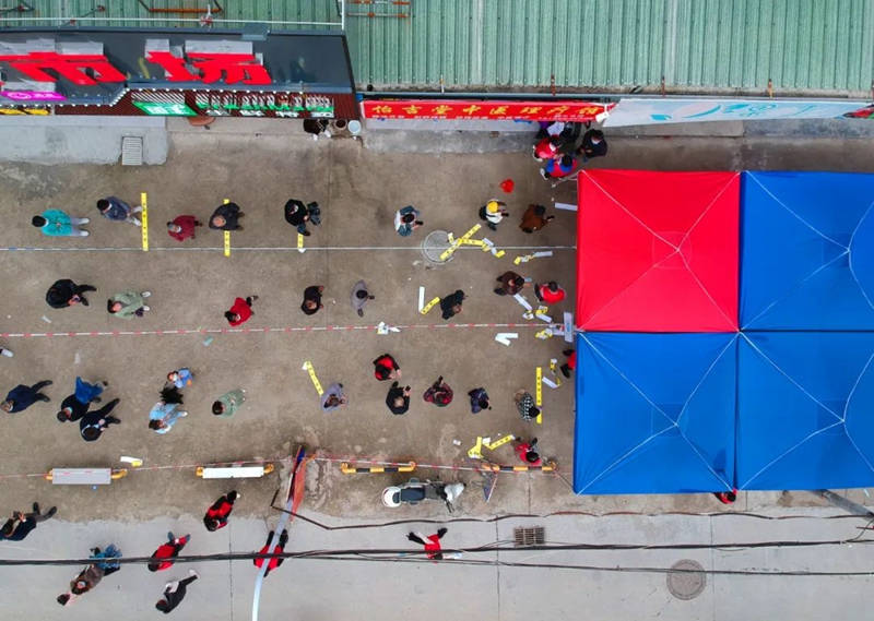3月27日,在建陽區童游街道周家村核酸檢測采樣點,市民正有序排隊等候進行核酸檢測。黃杰敏 攝