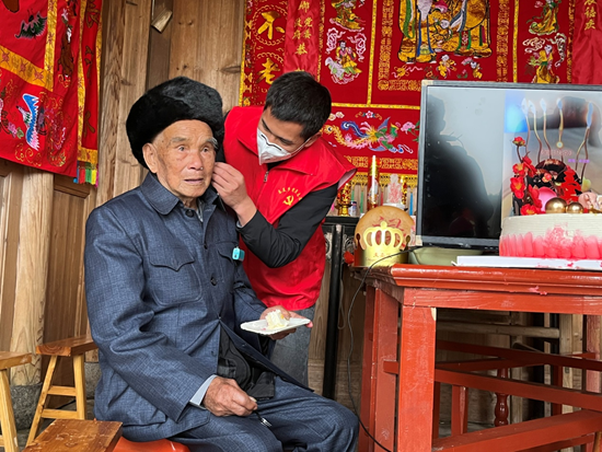 鄰里互助志愿隊為百歲老人蘇開萼簡單慶生。(春美鄉供圖)