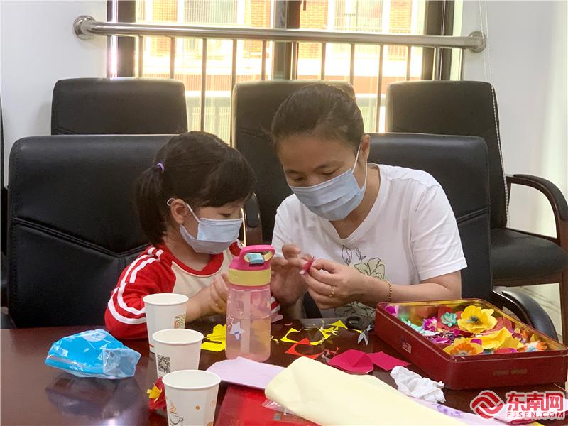 親子攜手制作紙扎小花(周芷薇 攝)