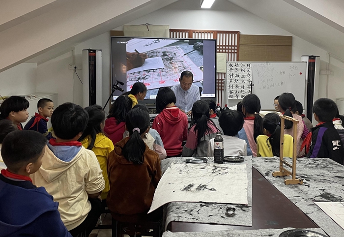 老師指導學生練習書法(泉港區委文明辦供圖)