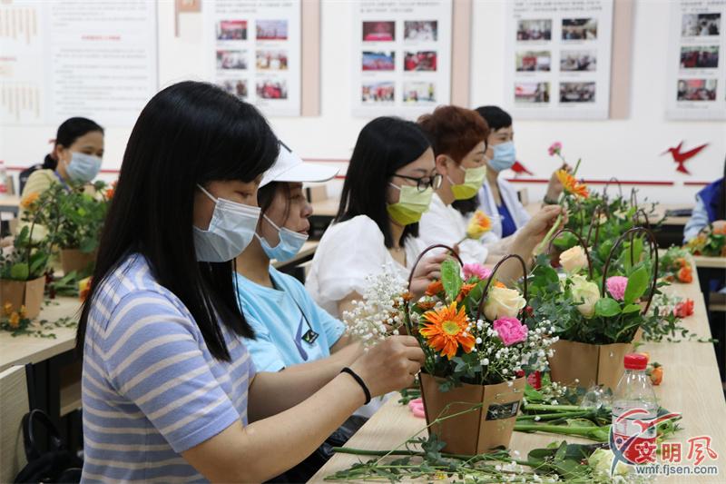 活動當天,前埔南社區組織轄區婦女們參加插花學習、鮮花活動以及就業宣講等活動。現場,花藝老師為前埔南“微光媽媽團”的巾幗志愿者們講解了選花、顏色搭配、造型打造等插花技巧,還講解了各種花所蘊含的花語和祝福,及現場演示插花方法。大家一邊聽講解,一邊跟著老師學習修剪花枝、現場氣氛非常活躍。