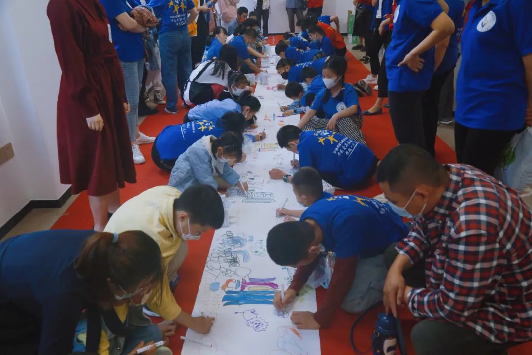 活動在春風里小區業主的愛心禮物贈送儀式中拉開序幕,隨后,10戶愛心家庭和30組自閉癥孩子以“家園”為主題,通過“藍天、白云、太陽、愛心”等元素,與志愿者家庭攜手共同繪制一幅百米畫卷藍圖。