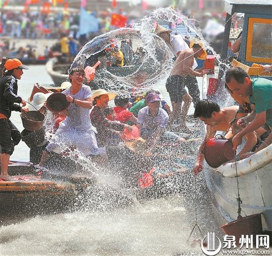 石獅市蚶江鎮的海上潑水民俗活動,是國內唯一海上潑水節,至今已傳承了200多年,成為一種別具特色的閩臺對渡文化習俗,入選第三批國家級非遺名錄。自古以來,蚶江與臺灣彰化鹿港商貿往來頻繁,因此有著密切的對渡往來,競舟潑水是蚶江與臺灣鹿港人端午節的特殊風俗。近年來,蚶江和鹿港同胞一起將其演變成為富有閩南特色的“海上潑水節”盛大活動。每逢端午節,兩岸對渡的船只都要在蚶江海邊追逐潑水,上百艘船揚帆出海,一起在海上演繹激情水戰,交融情誼,并祈求平安興旺。